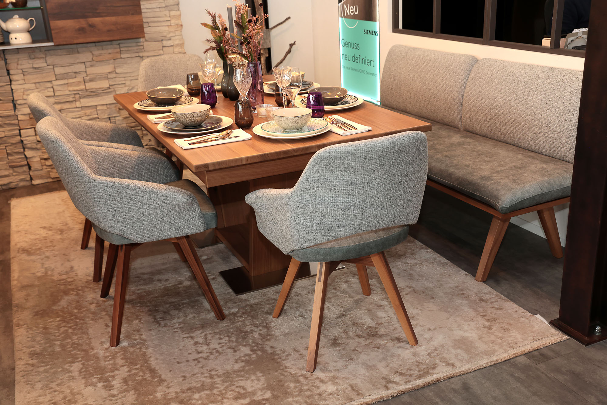 Speisegruppe LUNA – Säulentisch LUCCA & Bank mit 4 Armlehnstühlen | Schösswender